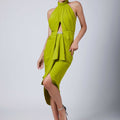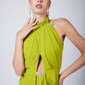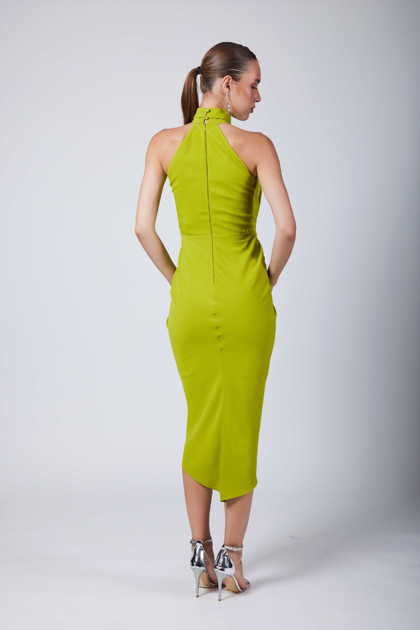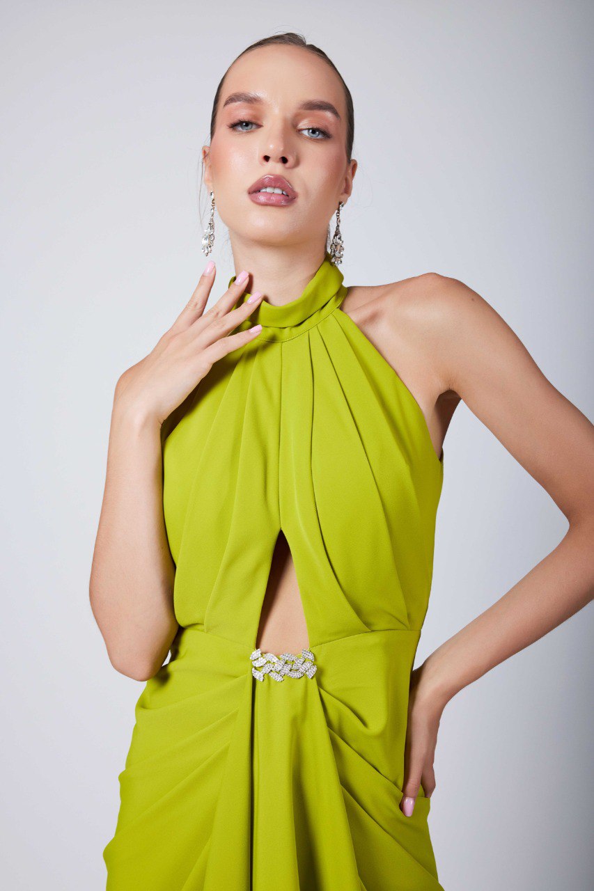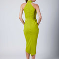 Make a bold statement with this lime green halter midi dress, designed for modern elegance and effortless sophistication. The high neckline with soft pleating creates a refined and flattering silhouette, while the keyhole cut-out at the bodice adds a contemporary edge.