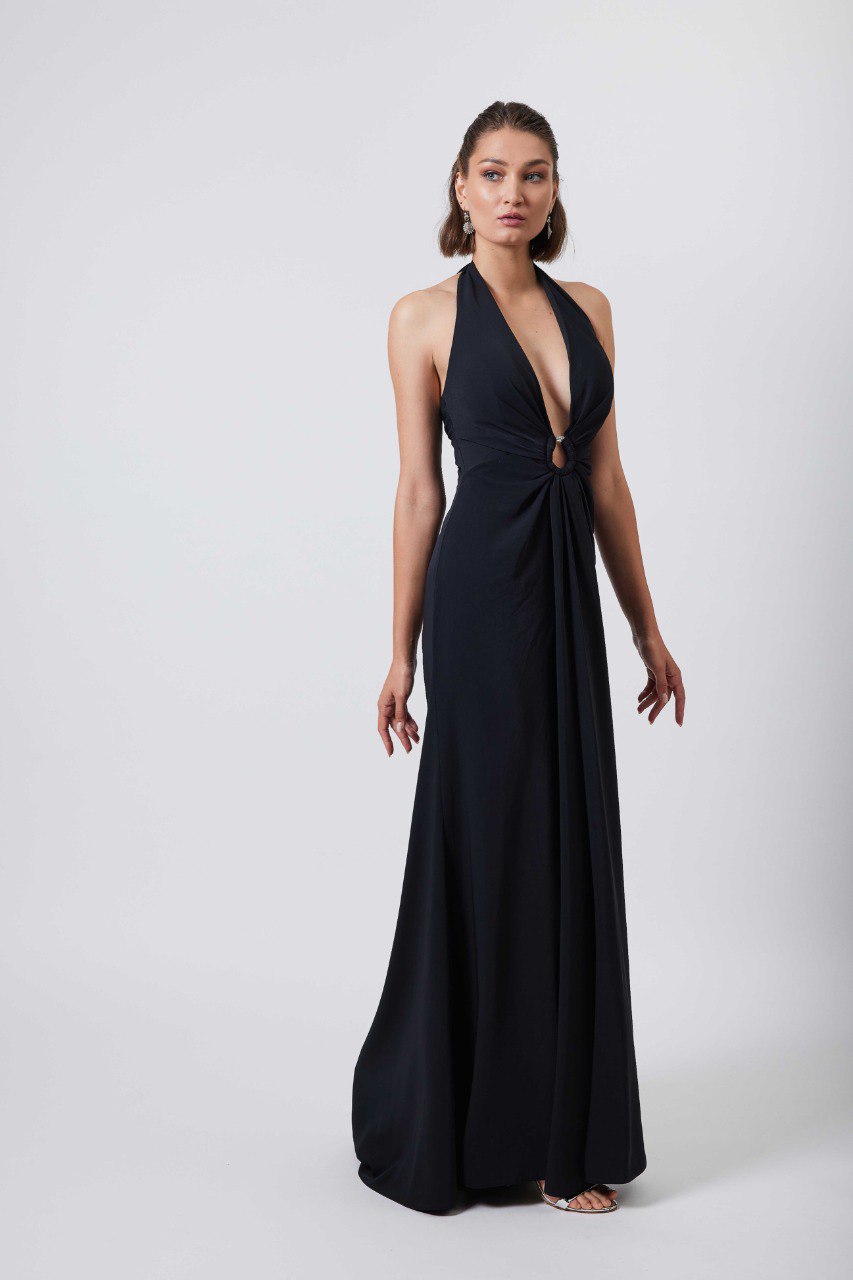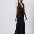 The plunging halter neckline with a delicate center cut-out adds a touch of sensuality, while the flowing silhouette creates a mesmerizing, ethereal movement. Crafted from luxuriously soft, draped fabric, this gown contours beautifully to your figure, enhancing natural curves with subtle gathering at the waist. The open-back design brings a bold yet sophisticated finish, making it the perfect statement piece for any grand occasion.