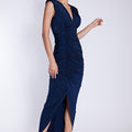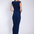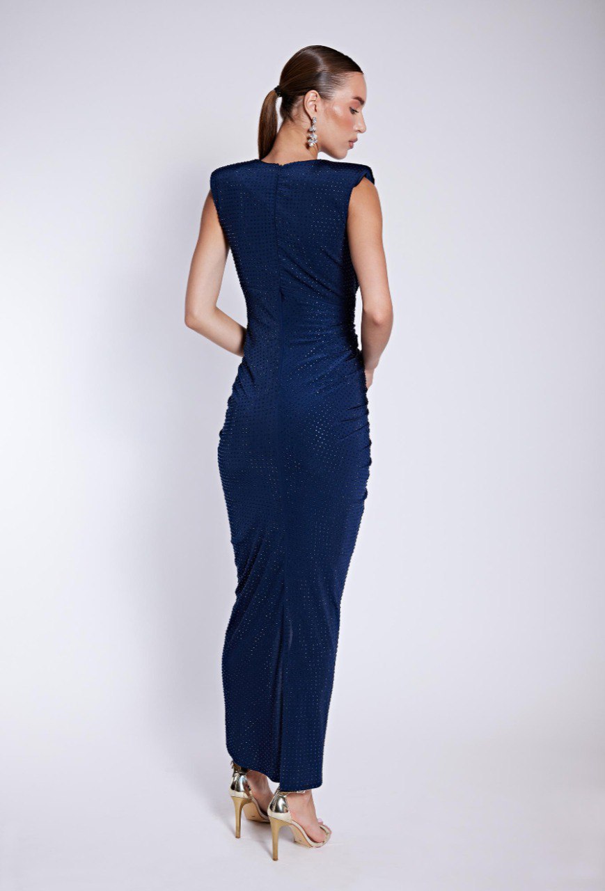 Step into elegance with this stunning navy ruched maxi dress, designed for a show-stopping look at any special event. Crafted from a shimmering, figure-hugging fabric, this dress features a deep V-neckline and structured shoulders that create a bold yet refined silhouette.